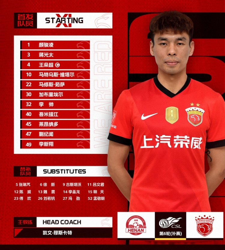 中超联赛第6轮(补赛),上海海港今日首发名单