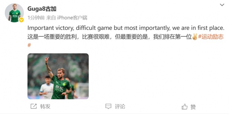 6月18日讯 国安外援古加更新社媒,庆祝球队登顶中超积分榜。中超昨晚进行一场补赛,北京国安主场1-0击败青岛西海岸,凭借...