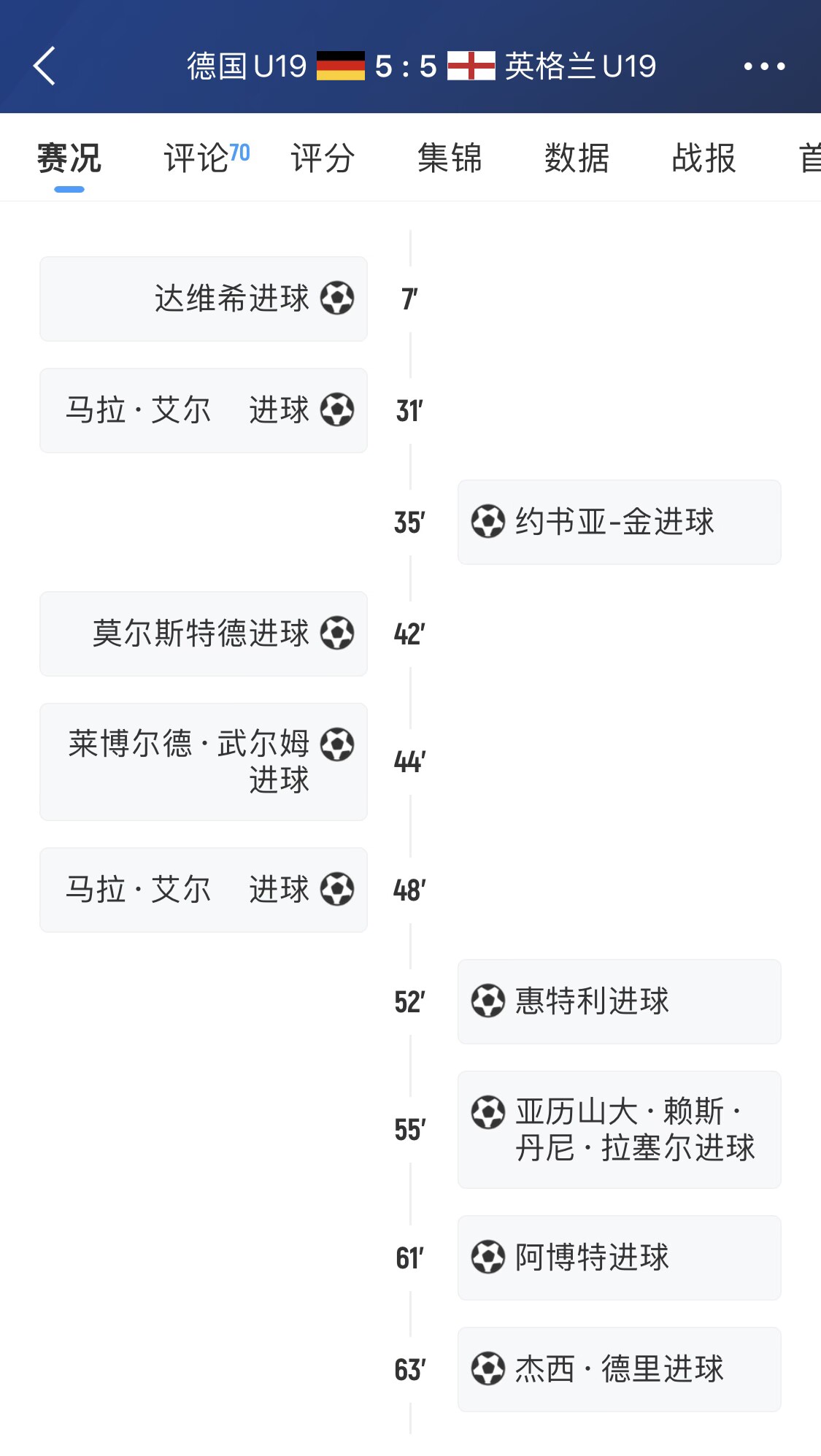 06月18日讯 U19欧青赛小组赛第二轮,德国U19在5-1领先的情况下,被英格兰连扳4球5-5逼平,丧失半决赛晋级主动...