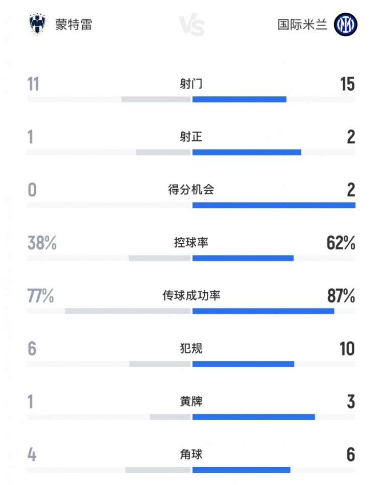 国米1-1蒙特雷数据:国米15射2正,控球率62%、传球成功率87%