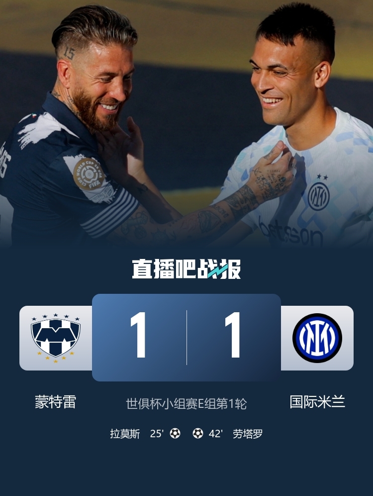 齐沃首秀无缘开门红!国米1-1蒙特雷 拉莫斯头槌破门劳塔罗扳平