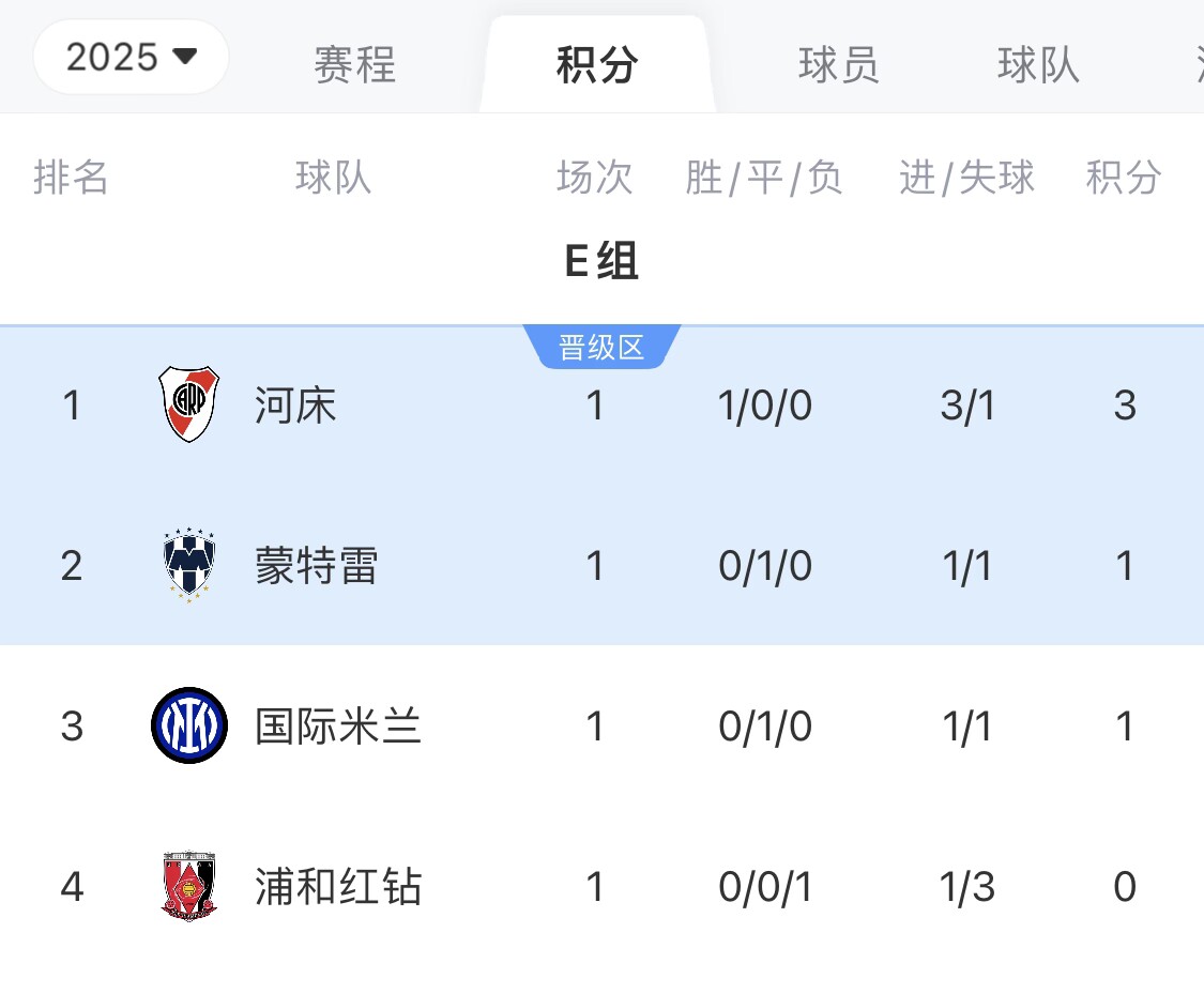 末轮直接对话!世俱杯E组积分榜:河床小组第一,国米战平后排第3