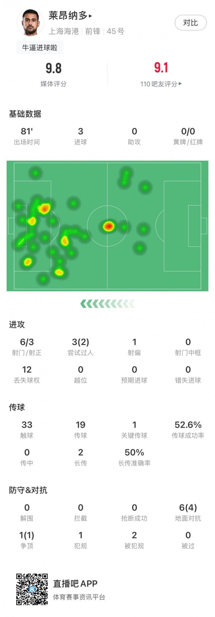 工体戴帽,莱昂纳多全场数据:6射门3射正,评分9.8分全场最高