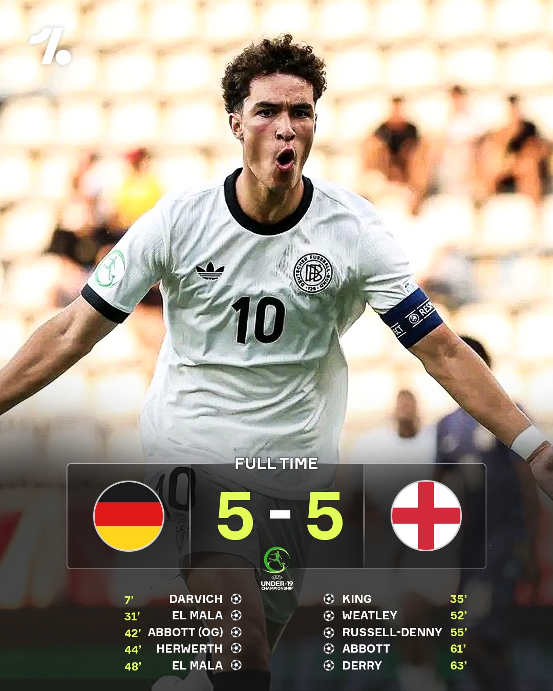 😲1-5落后连追4球变5-5!英格兰&德国创U19欧洲杯最大比分纪录