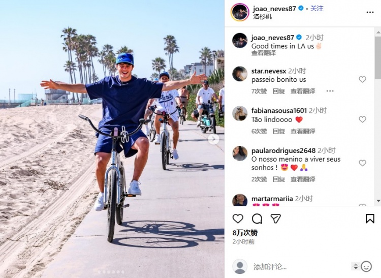 大战后享受闲暇时光,巴黎中场若昂-内维斯晒骑自行车照片