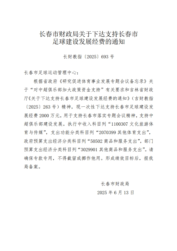 长春市财务局下达2000万元经费,包括支持中超俱乐部建设发展