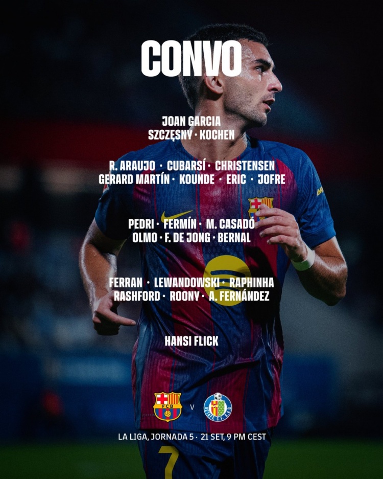 巴萨对赫塔费大名单:莱万、拉什福德在列,亚马尔、加维仍缺席
