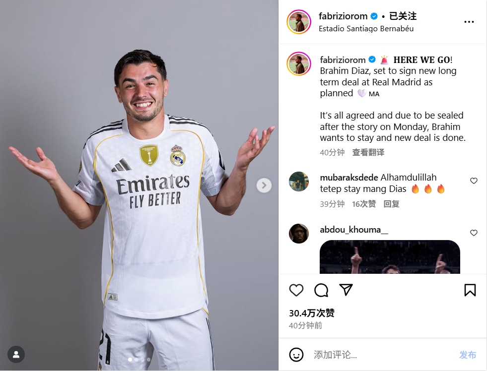 Here We Go!罗马诺:皇马与边锋迪亚斯签下一份长约