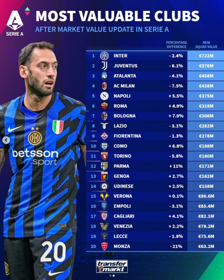 意甲球队德转身价排行:国米7.22亿欧居首,尤文亚特兰大二三位