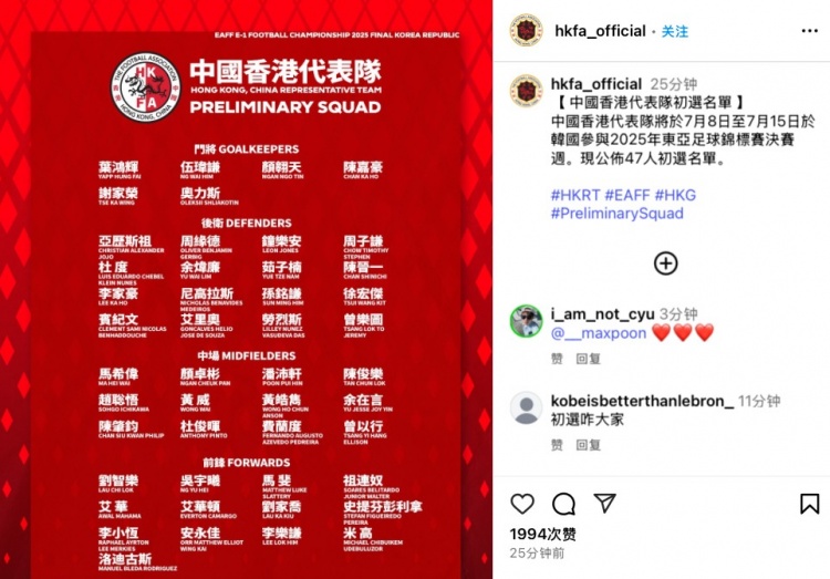 中国香港队东亚杯47人初选名单:12人来自中超中甲,陈晋一领衔