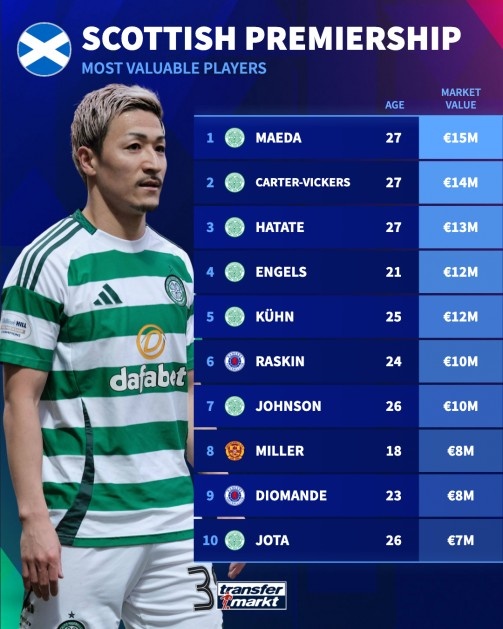 德转苏超球员身价:前田大然1500万欧居首,Top10凯尔特人占7
