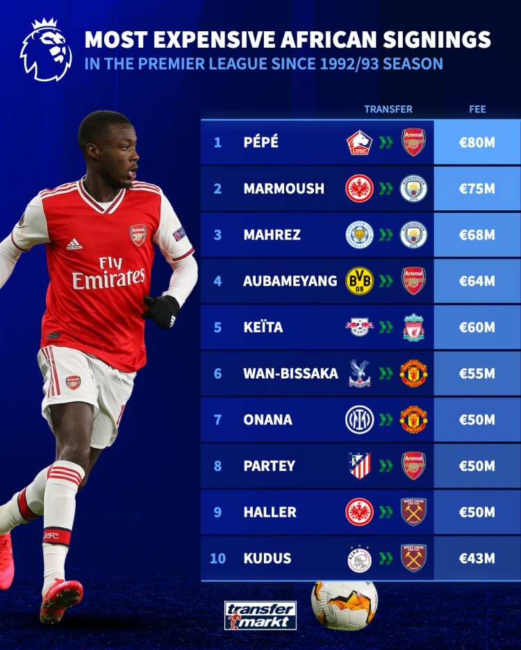 6月17日讯 近日,德转官方总结了进去英超时代后非洲球员转会费最高的10名球员,其中尼古拉斯-佩佩以8000万欧居首,马...