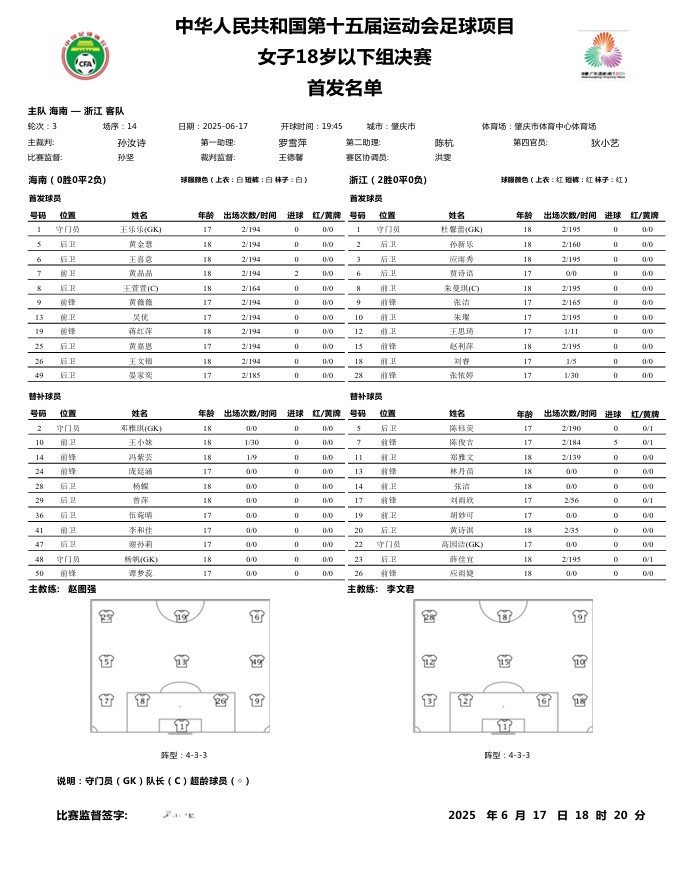 第十五届全运会足球项目 女子U18决赛海南vs浙江首发名单