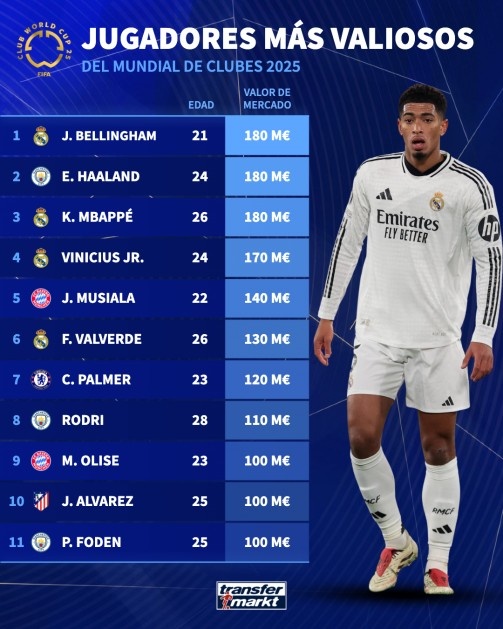 世俱杯球员身价排行:贝林&哈兰德&姆总并列第一 4皇马球员前十