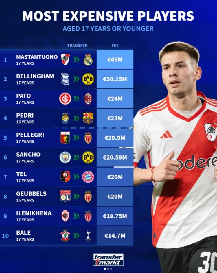 6月17日讯 德转列U17球员转会费排行,马斯坦托诺4500万欧居首,贝林厄姆3015万欧第二,帕托第三。德转U17球员...