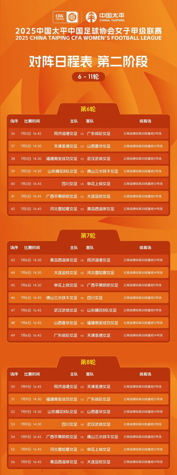 2025中国太平女甲联赛 第二阶段(6-11轮)赛程表更新 ​​​