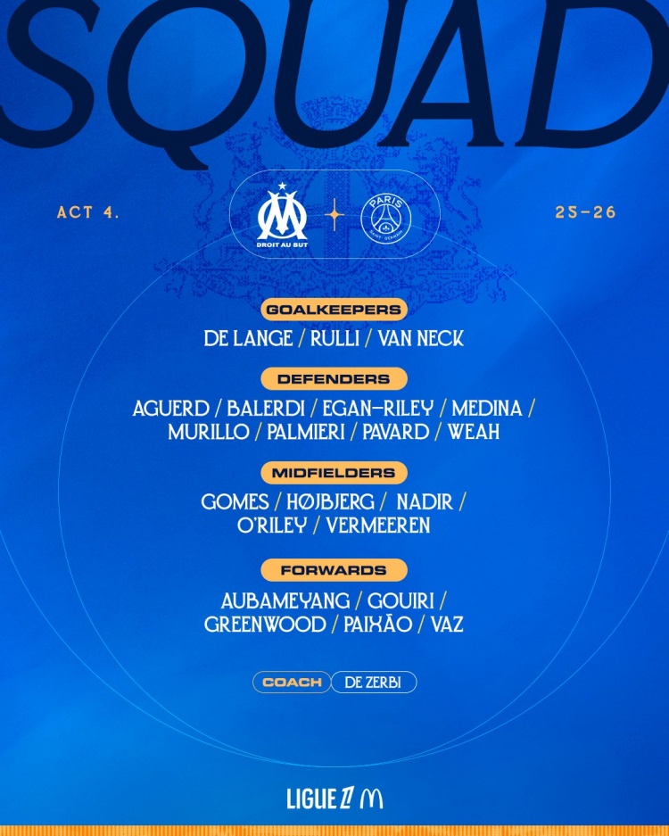 马赛对阵巴黎名单:格林伍德、奥巴梅扬、帕瓦尔、霍伊别尔在列