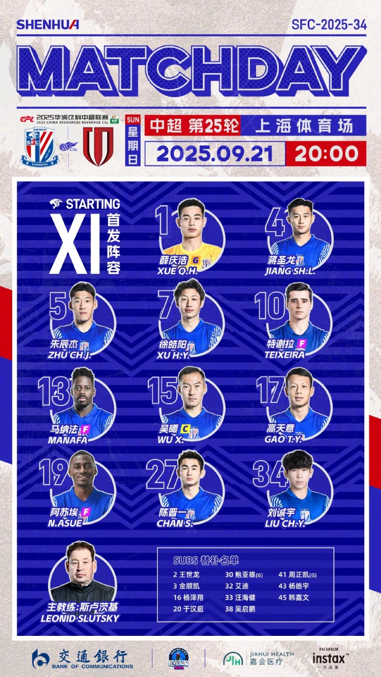 2025华润饮料中超联赛第25轮 上海申花 vs 成都蓉城 首发名单 ​​​...