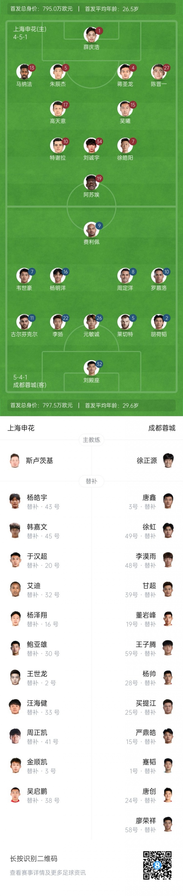 中超联赛第25轮上海申花vs成都蓉城首发名单