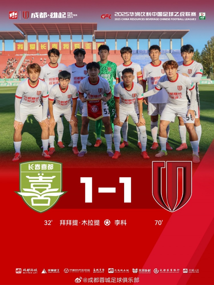 中乙联赛第26轮:成都蓉城B队客场1-1长春喜都