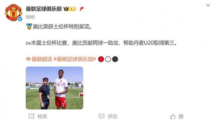 2球1助攻!官方:曼联17岁丹麦前锋奥比-马丁获土伦杯特别奖