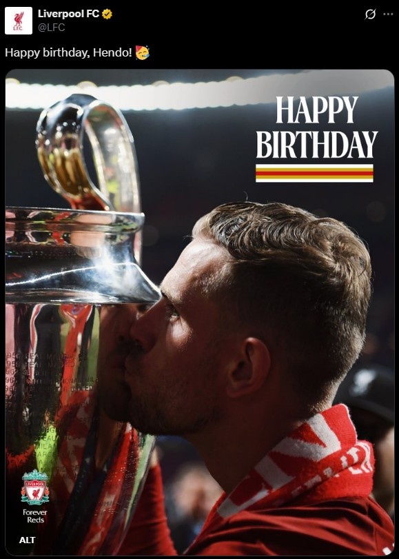 乔丹-亨德森今天迎来35岁生日,利物浦&英格兰队送祝福