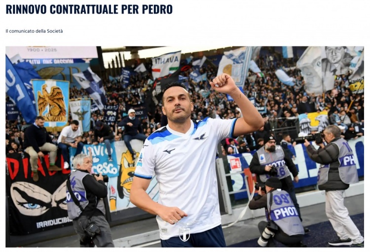 官方:拉齐奥与37岁边锋佩德罗续约至2026年6月30日
