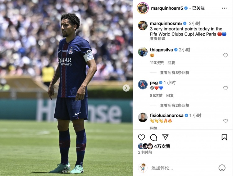 马尔基尼奥斯社媒:在世俱杯取得关键3分!前进吧巴黎!🔴🔵