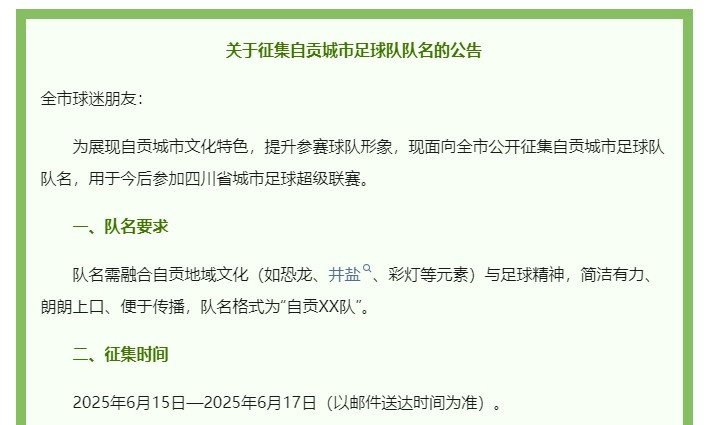 6月16日讯 据澎湃新闻报道,四川自贡市教育和体育局自6月15日起向全市公开征集自贡城市足球队队名,用于今后参加四川省城...