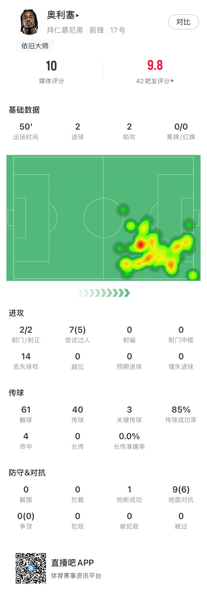 奥利塞vs奥克兰城半场数据:2球2助攻,关键传球3,评分10