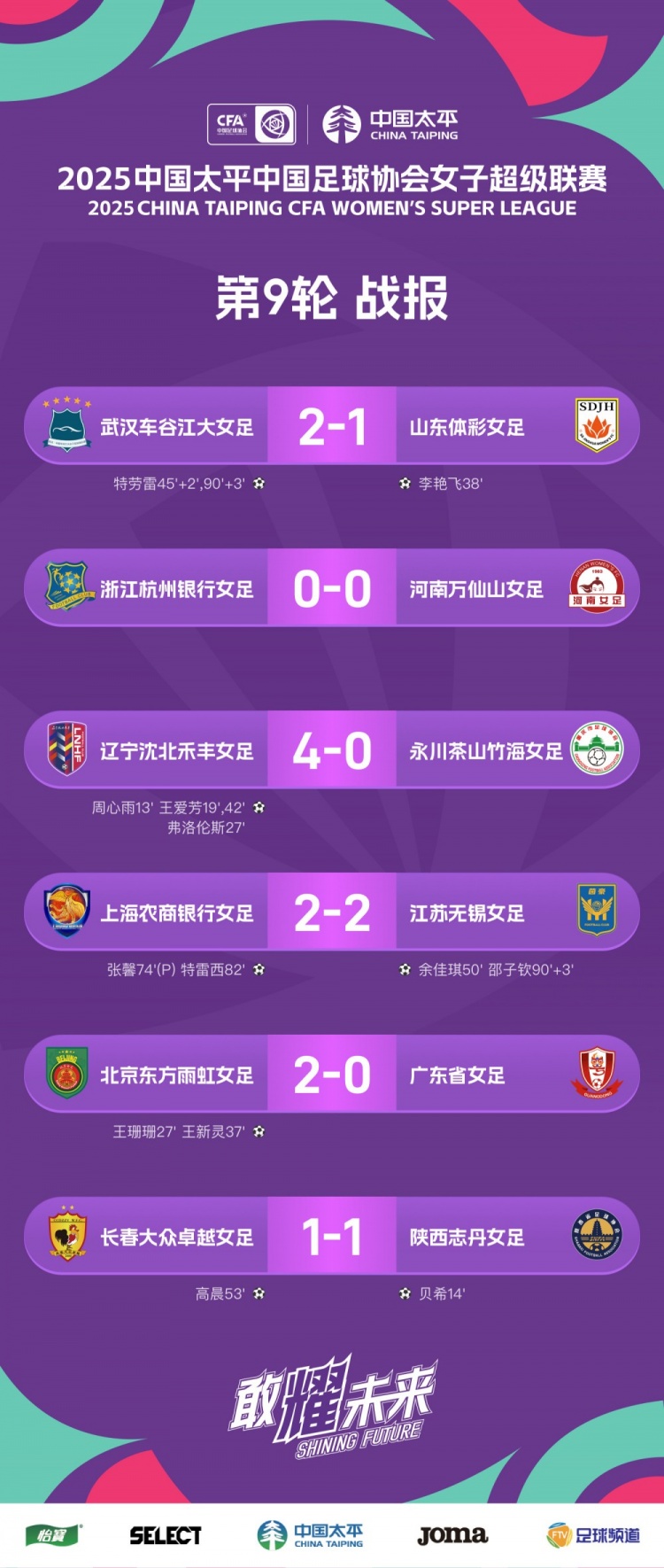 女超联赛第9轮 战报、积分榜、射手榜 ​​​