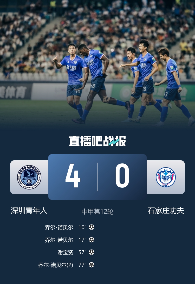 中甲-深圳青年人4-0石家庄功夫送对手2连败 乔治-诺贝尔3射1传