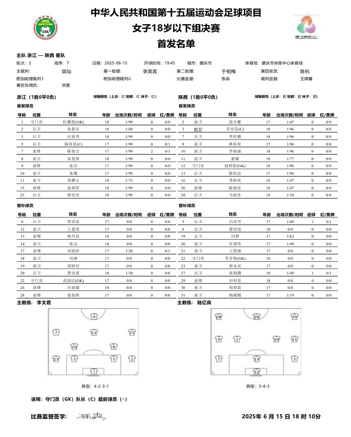 中华人民共和国第十五届运动会足球项目 女子十八岁以下组 决赛浙江vs陕西首发名单 ​​​...