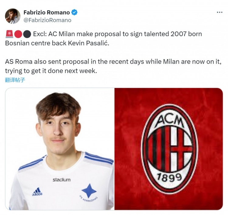罗马诺:米兰有意18岁瑞典中卫帕萨利奇,球员身高1米95