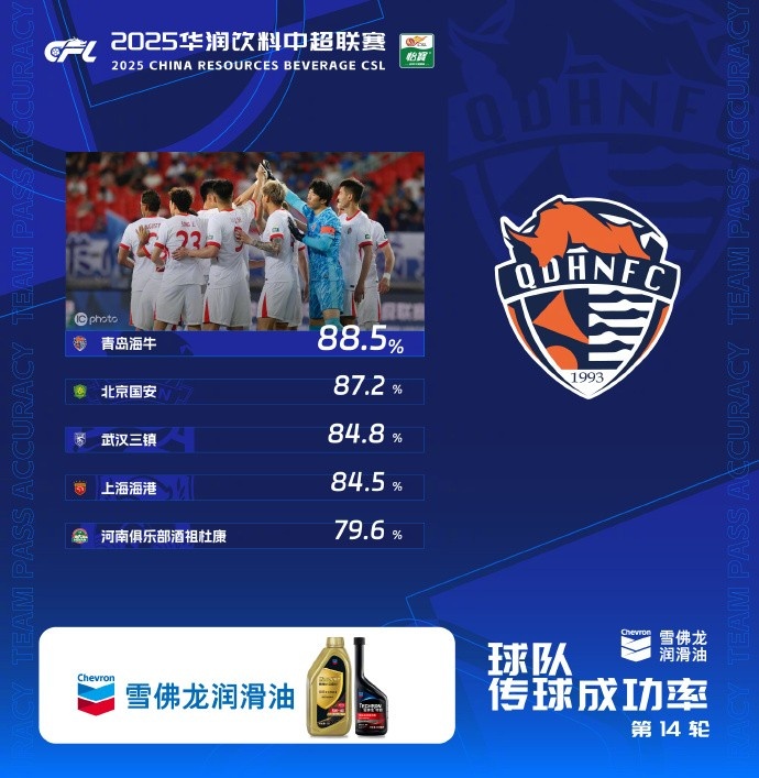 中超第14轮传球成功率榜:海牛88.5%居首,国安第二、三镇第三