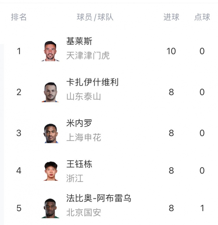 中超射手榜:基莱斯10球领跑,王钰栋、米内罗、瓦科、法比奥8球