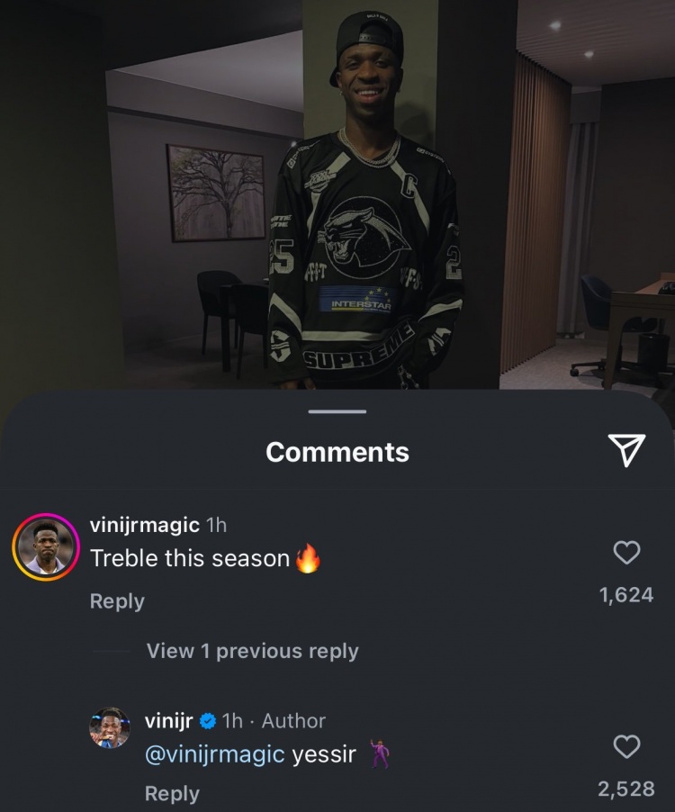 有信心!球迷留言希望下赛季赢得三冠王,维尼修斯回复“yessir”