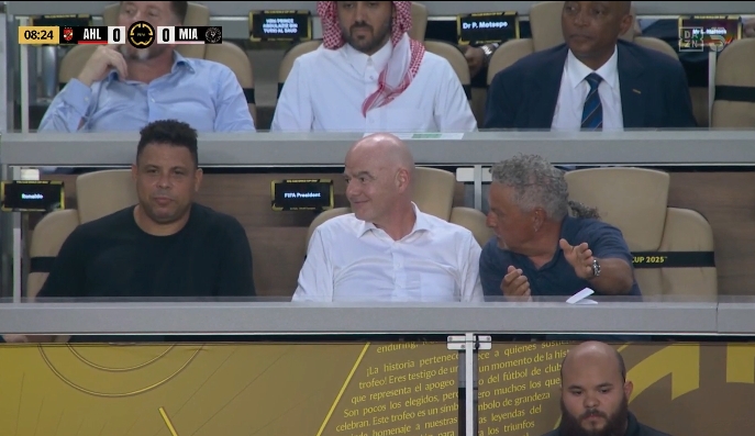 镜头给到看台,因凡蒂诺、大罗、巴乔现场观战世俱杯揭幕战