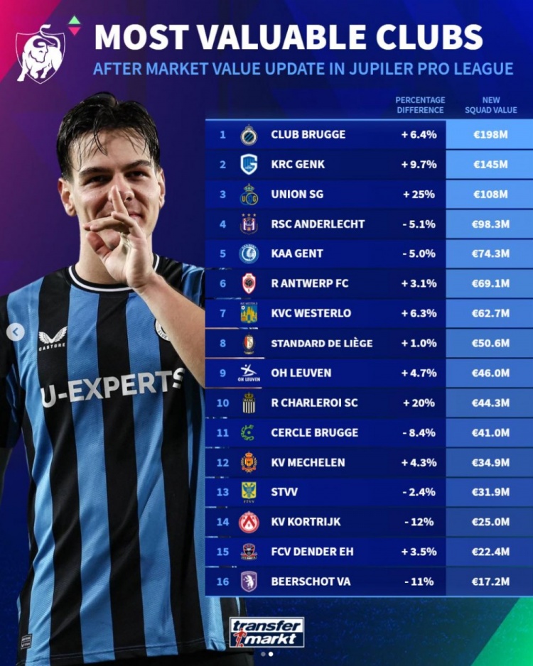 德转比甲球队身价排名:布鲁日1.98亿居首,亨克、圣吉罗斯二三位