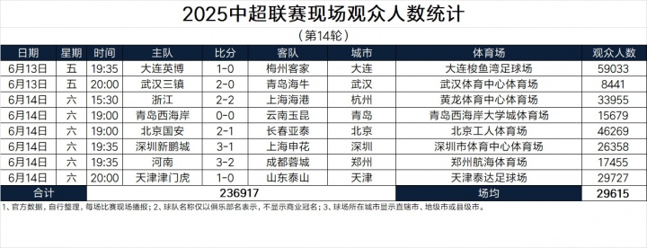 2025中超联赛现场观众人数统计(第14轮) 大连英博本轮比赛现场观众59033人,为中超历史第6高数据。...
