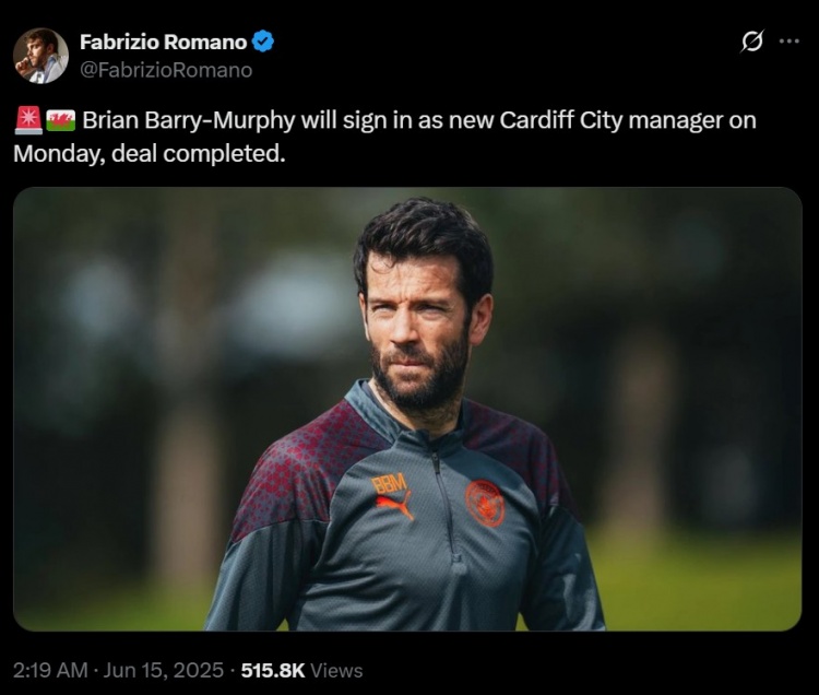 罗马诺:巴里-墨菲将出任卡迪夫城新帅,周一签约&交易已完成