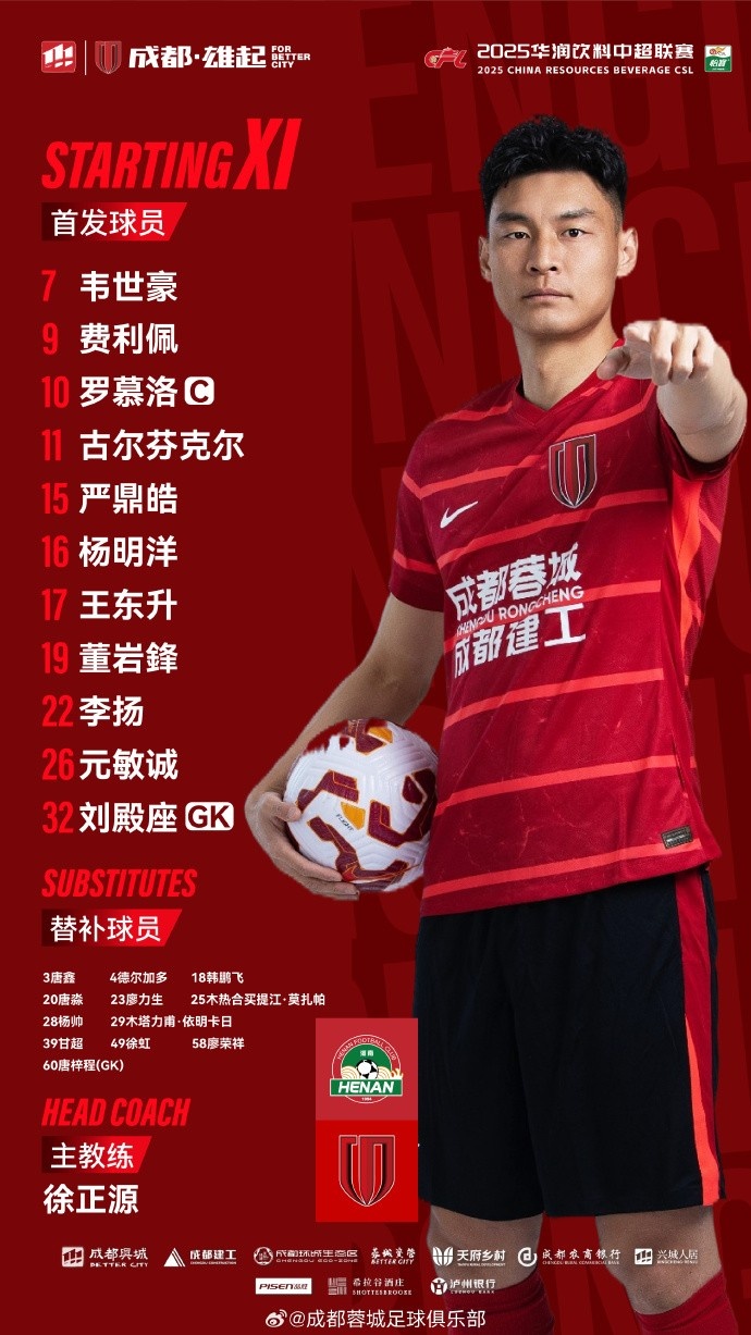 河南VS成都蓉城比赛首发名单出炉!成都,雄起!