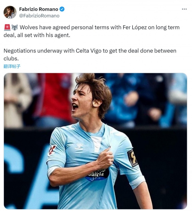 罗马诺:狼队与21岁边锋洛佩斯谈妥个人条款,正与塞尔塔谈判