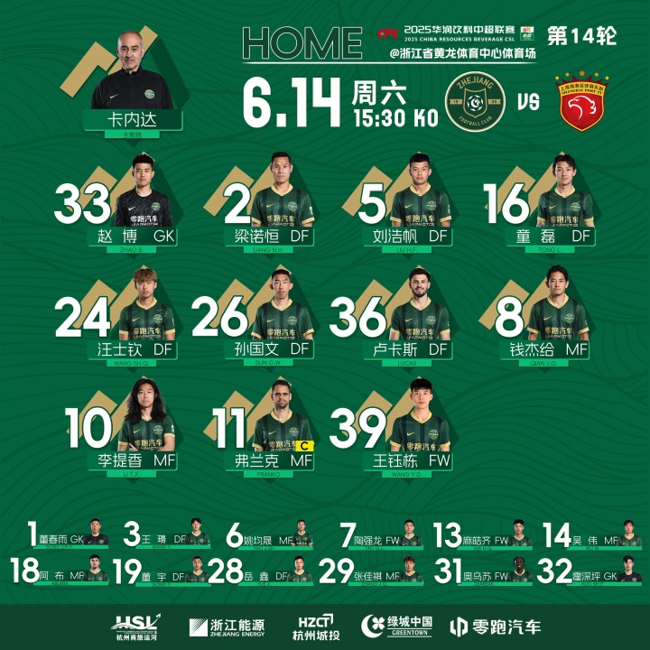 06月14日讯 中超第14轮浙江vs上海海港今日15:30进行,两队公布首发阵容,2外援vs4外援,武磊伤缺。浙江队首发...