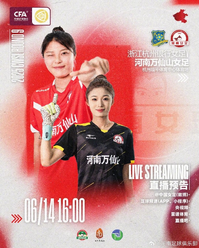 6月14日16:00,女超联赛第9轮河南万仙山女足VS浙江杭州银行女足