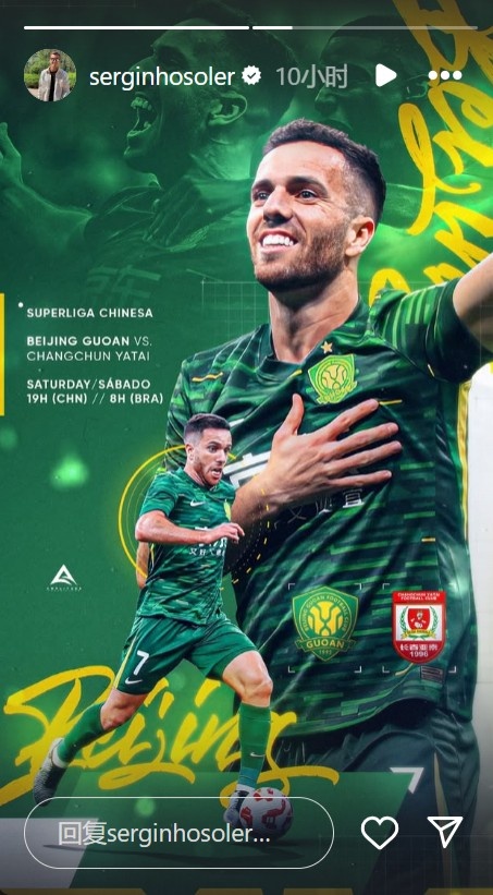 6月14日讯 国脚塞尔吉尼奥更新社媒,发布对阵亚泰的个人海报。今天19点,中超第14轮,北京国安主场对阵长春亚泰,国安中...