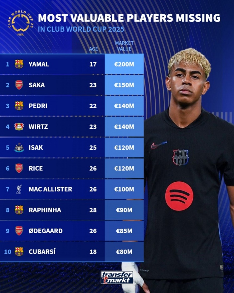 缺席世俱杯球员德转身价榜:亚马尔2亿欧居首,萨卡1.5亿欧次席
