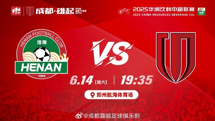 比赛日2025华润饮料中超联赛 第14轮⚽ 河南俱乐部酒祖杜康 vs 成都蓉城📅 6月14日(周六)19:35🥅 郑州航...