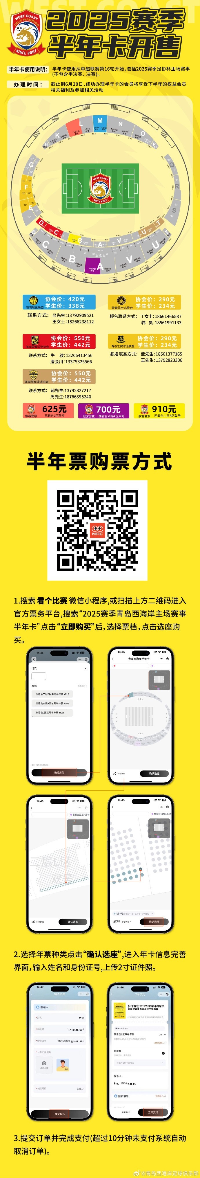 6月14日讯 中超青岛西海岸官方消息,俱乐部发售2025赛季半年卡。青岛西海岸半年卡使用从中超第16轮开始,包括足协杯主...
