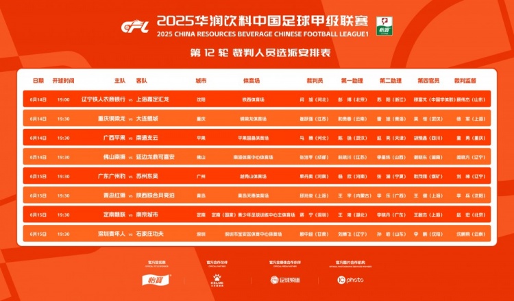 6月14日讯 中甲官方公布第12轮裁判安排,崔跃执法铜梁龙vs大连鲲城,单丹奥执法广州豹vs苏州东吴。附中甲第12轮裁判...